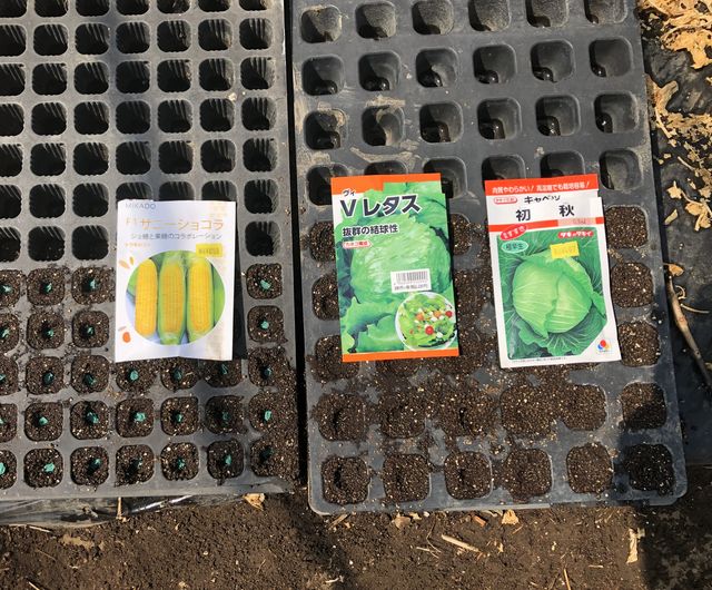 トウモロコシ・キャベツ・レタスの種まき(3月30日)