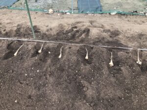 波板を傾斜をつけて畑に設置し、その上に土をかぶせ種芋をのせ土で覆う。こうすると掘るときに楽。4