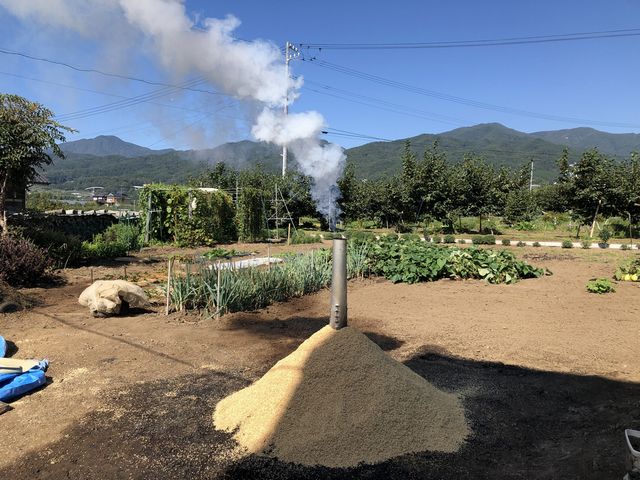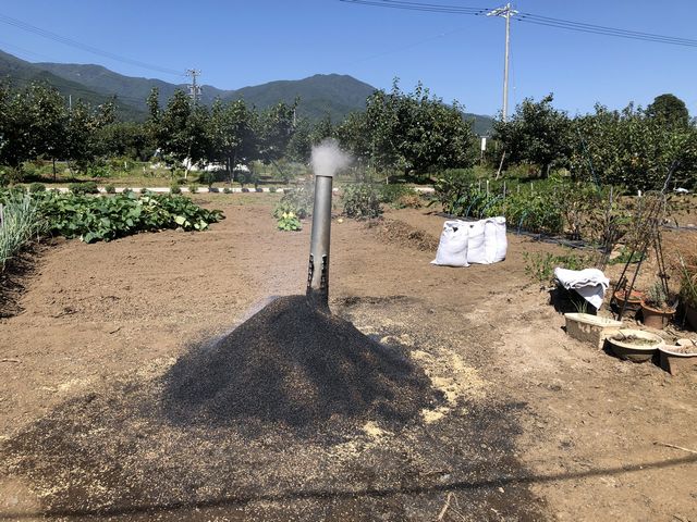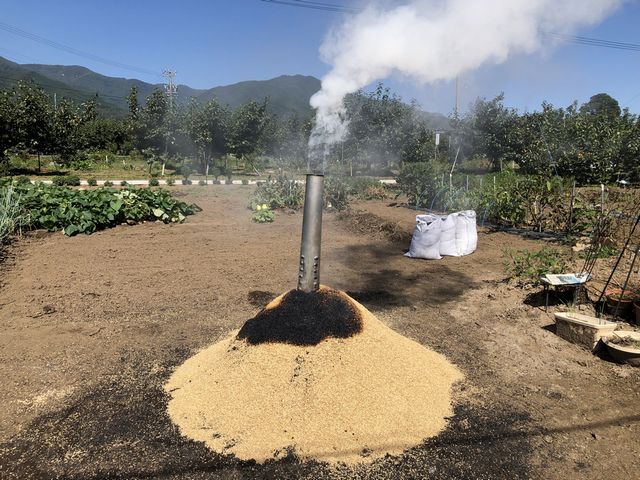 時々混ぜながら根気のいる作業 水かけも気が抜けなく、見極めないと灰になってしまう。
